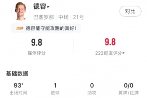 本场比赛荷兰中场弗兰基•德容为巴萨首发踢满全场,全场比赛他不仅完成破门,还成为球队的节拍器,传球多达116脚的同时,传球成功率高达97%。最终他获得了9.8分的全场最高评分。