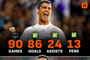 Livescore对比了C罗与姆佩巴两人加盟皇马前90场的数据:其中C罗打进84球24次助攻,主罚点球13次,而姆巴佩打进82球,贡献10助攻,罚点19次。