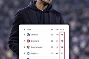 在英超积分榜上,切尔西以48分位居第6,但仅仅领先位居第12的富勒姆3分,而且布伦特福德和伯恩茅斯和蓝军积分相同。