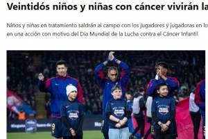 22名正在接受癌症治疗的儿童受邀来到俱乐部,他们将在2月7日男足对阵马洛卡的比赛,以及2月15日女足对阵埃瓦尔的比赛中,作为球童与巴塞罗那的球员们手牵手步入球场。